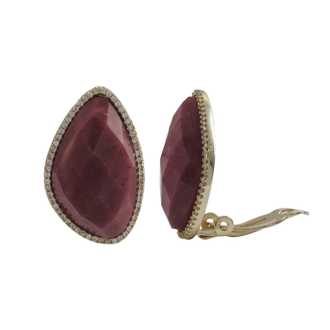 Rhodonite (Pink) Semi Precious Stone, With CZ Border, Gold Plated Sterling Silver Clip Earrings