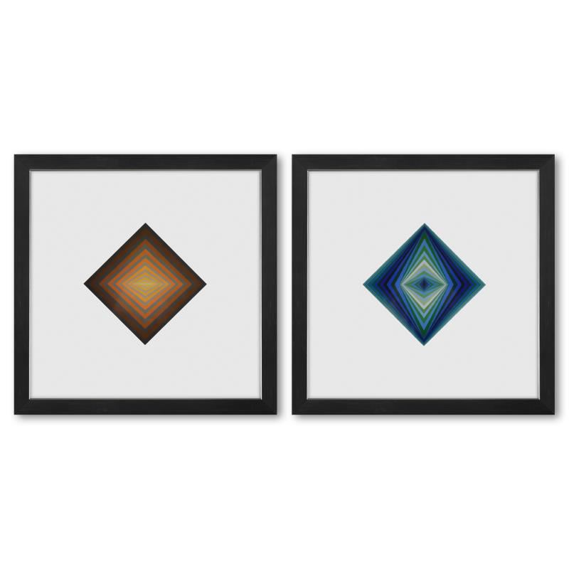 Rhombus - C et Rhombus de la serie Vonal (Diptych) by Vasarely (1908-1997). "Rhombus - C et Rhombus de la série Vonal (Diptych)" is a set of heliogravure prints on paper, published in 1971, by Victor Vasarely (1908-1997). These pieces come custom framed, with a letter of authenticity and with a 1976 Vasarely paperback. Measures approx. 11.5" x 11.5" (frame), 6" x 6" (image).