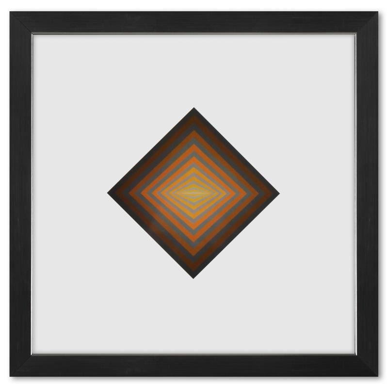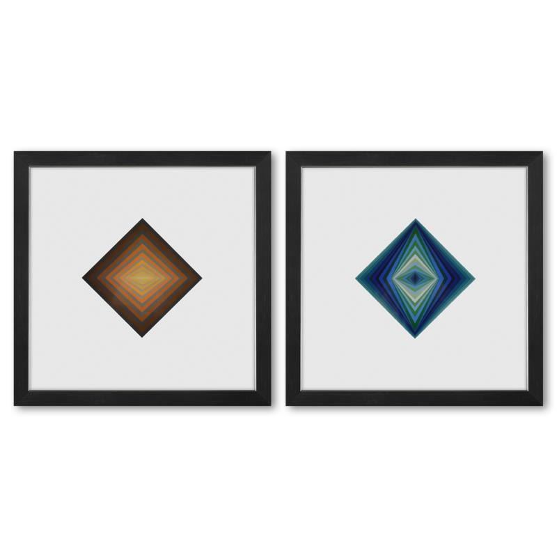 "Rhombus - C et Rhombus de la série Vonal (Diptych)" is a set of heliogravure prints on paper, published in 1971, by Victor Vasarely (1908-1997). These pieces come custom framed, with a letter of authenticity and with a 1976 Vasarely paperback. Measures approx. 11.5" x 11.5" (frame), 6" x 6" (image).