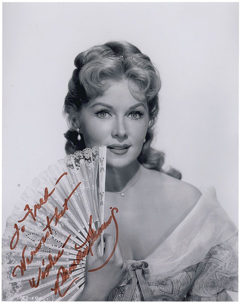 Satin-finish 8 x 10 photo of Fleming fanning herself, signed and inscribed in brown felt tip “To Fred—Warmest best wishes—Rhonda Fleming.” In fine condition, with a Rhonda Fleming personal collection embossed seal to lower right corner.