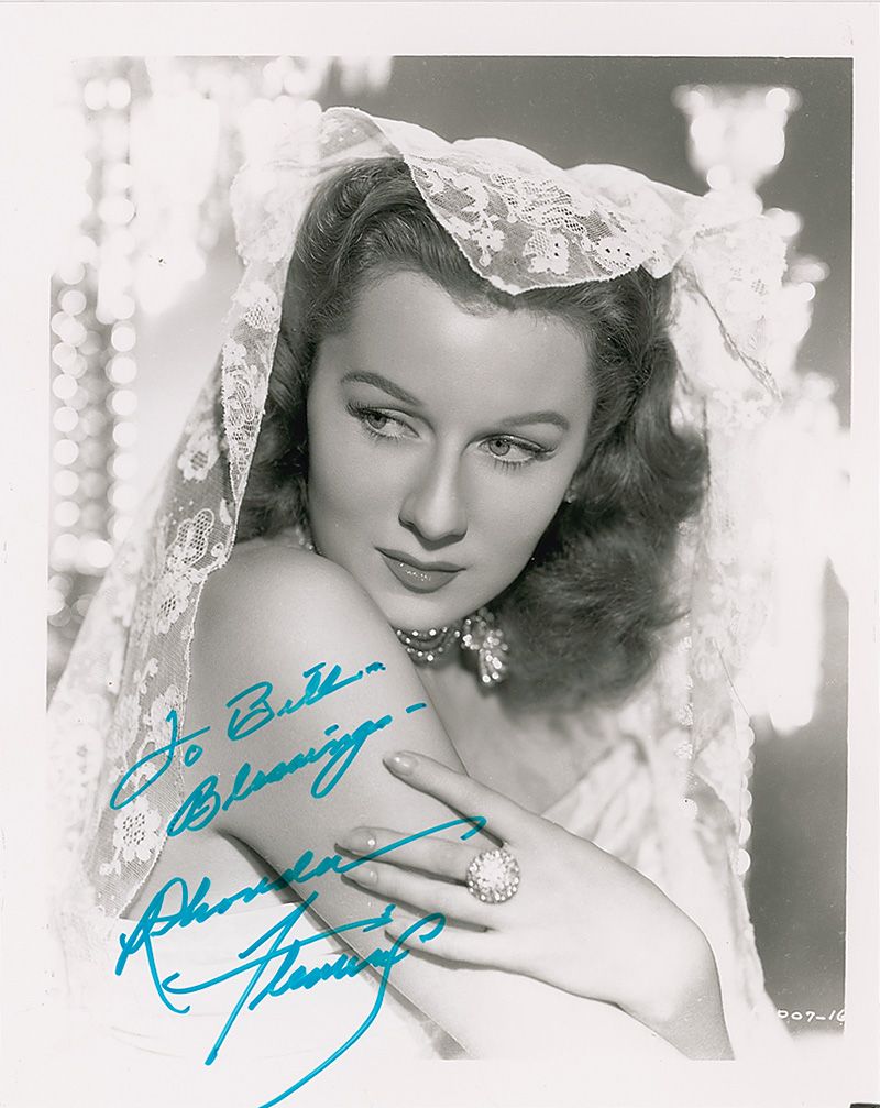 Glossy 8 x 10 photo, signed and inscribed in blue felt tip “To Bill, blessings—Rhonda Fleming.” In fine condition.