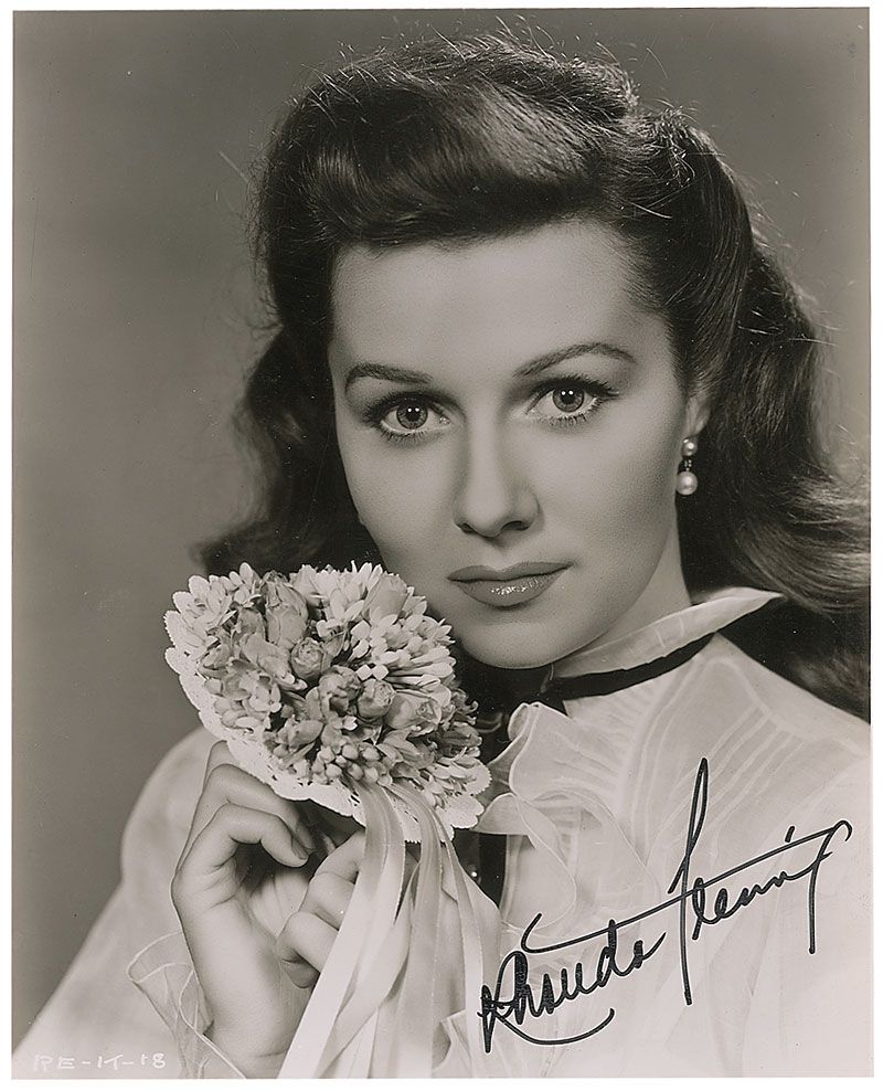 Glossy 7.75 x 9.5 photo of Fleming holding a small bouquet, signed in black felt tip. A couple horizontal streaks to the finish and lightly trimmed edges, otherwise fine condition.