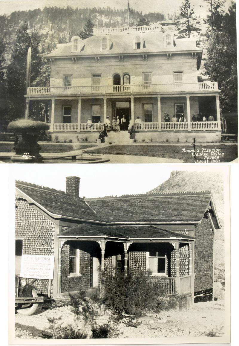Lot of three reprinted Nevada photographs. Photos include the following: 1) Aurora, NV reprint photograph of the “Choice Wines” Liquor, Beer, and Cigar store. This photo was originally taken sometime after the towns heyday, as there are crumbling building remains in the background accompanied by tumbleweeds and tussocks. 2) Rhyolite, NV street view photograph reprint of “The Bottle House.” This was preserved by the Beatty Improvement Association in January, 1925. 3) Washoe Valley, NV reprint photograph of the Bower’s Mansion around 1880. This three story building has 2 wrap-around porches on the first and second stories, large water fountain and gardens in the front yard area, with large bluffs in the background. There are 14 people standing on the first story porch at the time of the photo. All photo reprints measure 8” x 9 ¼” and are in good condition.