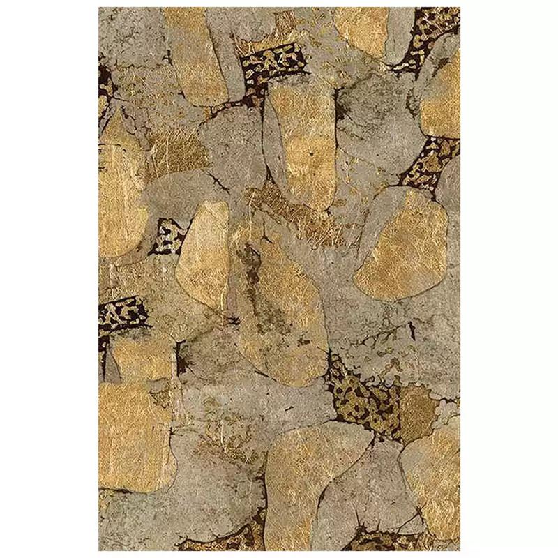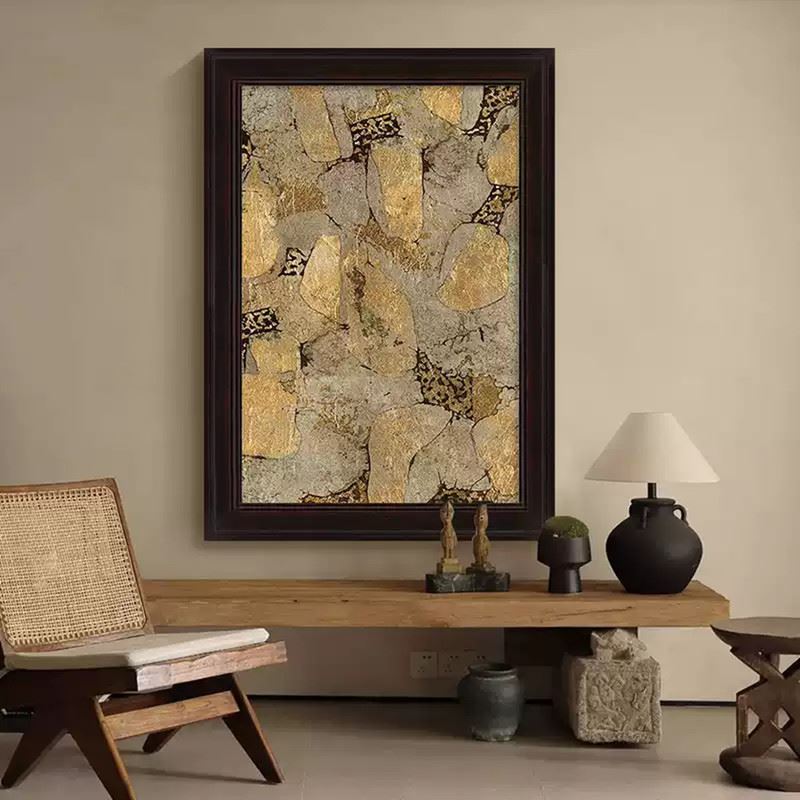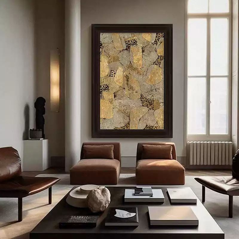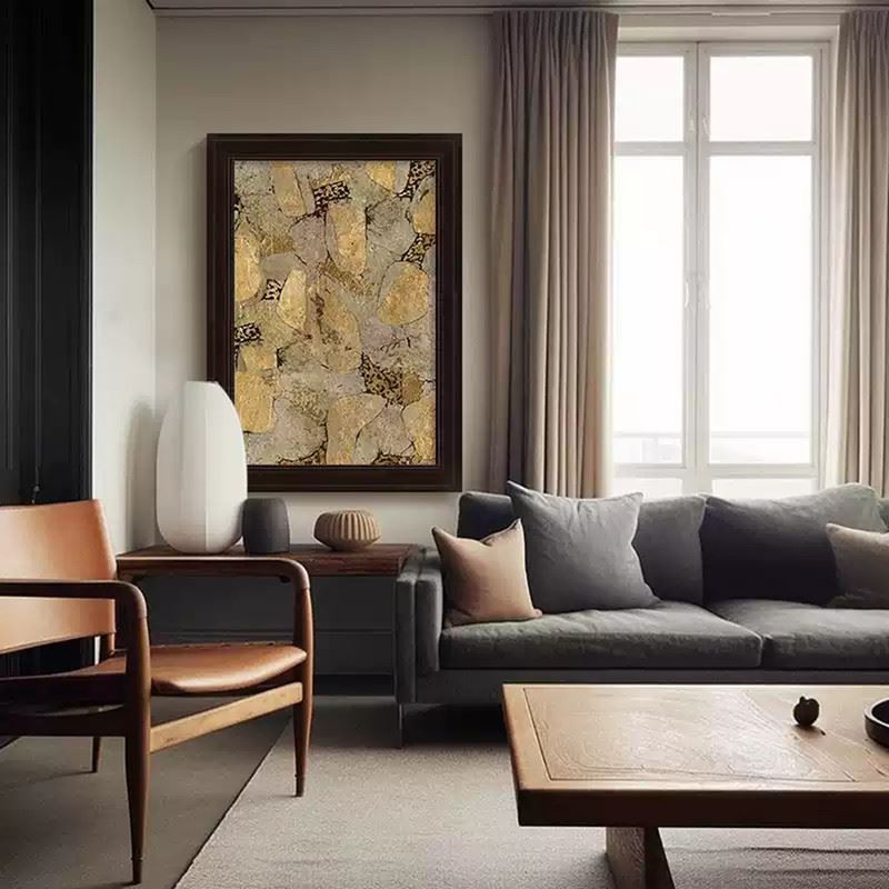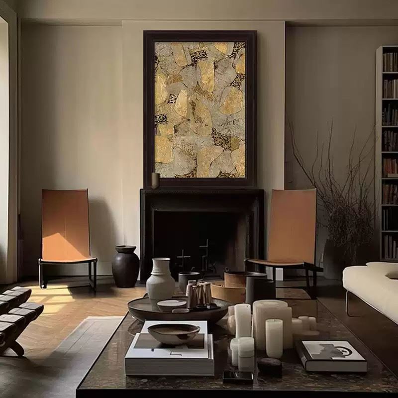 This artwork uses rich golden and grey tones to showcase the texture and natural forms of stone. The scattered shapes and intricate patterns present a perfect fusion of nature’s power and artistic expression. Dimensions: 24 x 35 inches.