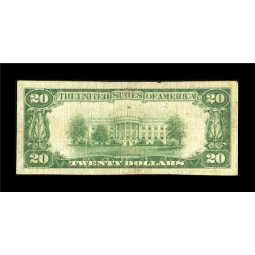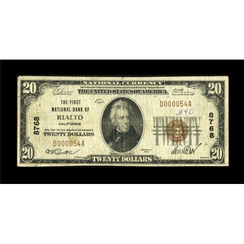 <B>Rialto, CA</B></I> - $20 1929 Ty. 1 <B>The First NB</B></I> Ch. # 8768<BR> A very tough small size note from well collected San Bernardino County. <B>Fine,</B></I> with a few pinholes and a small inked number under the right serial. <BR><I>From The Kansas City Collection.</B></I><BR><BR><b>Shipping:</b> Coins & Currency (<a target="_blank" href="http://www.heritageauctions.com/common/shipping.php">view shipping information</a>)