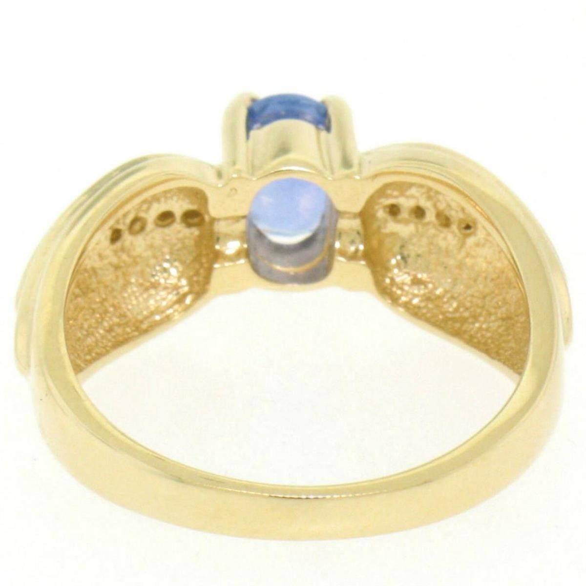 Ribbed 14k Yellow Gold 1.10ctw Oval Tanzanite Solitaire & Round Diamond Ring. A brand new solid 14k yellow gold ring with an oval cut natural tanzanite (5.34x6.85mm; 1.02ct) accented by 8 round brilliant cut natural diamonds (H - SI1; 0.08ctw). The ring is size 7.5, weighs a total of 6.3 grams, and measures 8.37mm wide.
