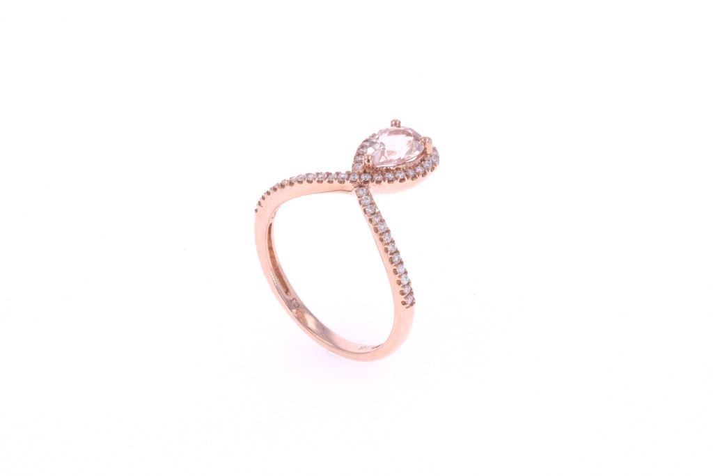 Featured in this lot is this ribbon design, morganite, diamond, and 14k rose gold ring. The ring shows a professionally crafted 14k rose gold ring set in a ribbon design, featuring a total gold weight of 2.80 GM. The ribbon decorative design is set with a pear cut morganite stone with a total weight of 0.63 carats; it is profusely decorated in pear shape halo design and down the shoulders by 45 total round brilliant cut diamonds with a total weight of 0.28 carats. The ring features the Color Jewels hallmark with a 14k gold stamp on the underside of the ring band. The ring size is US 7.