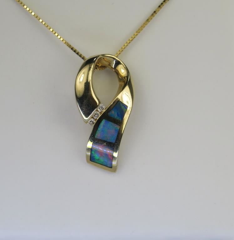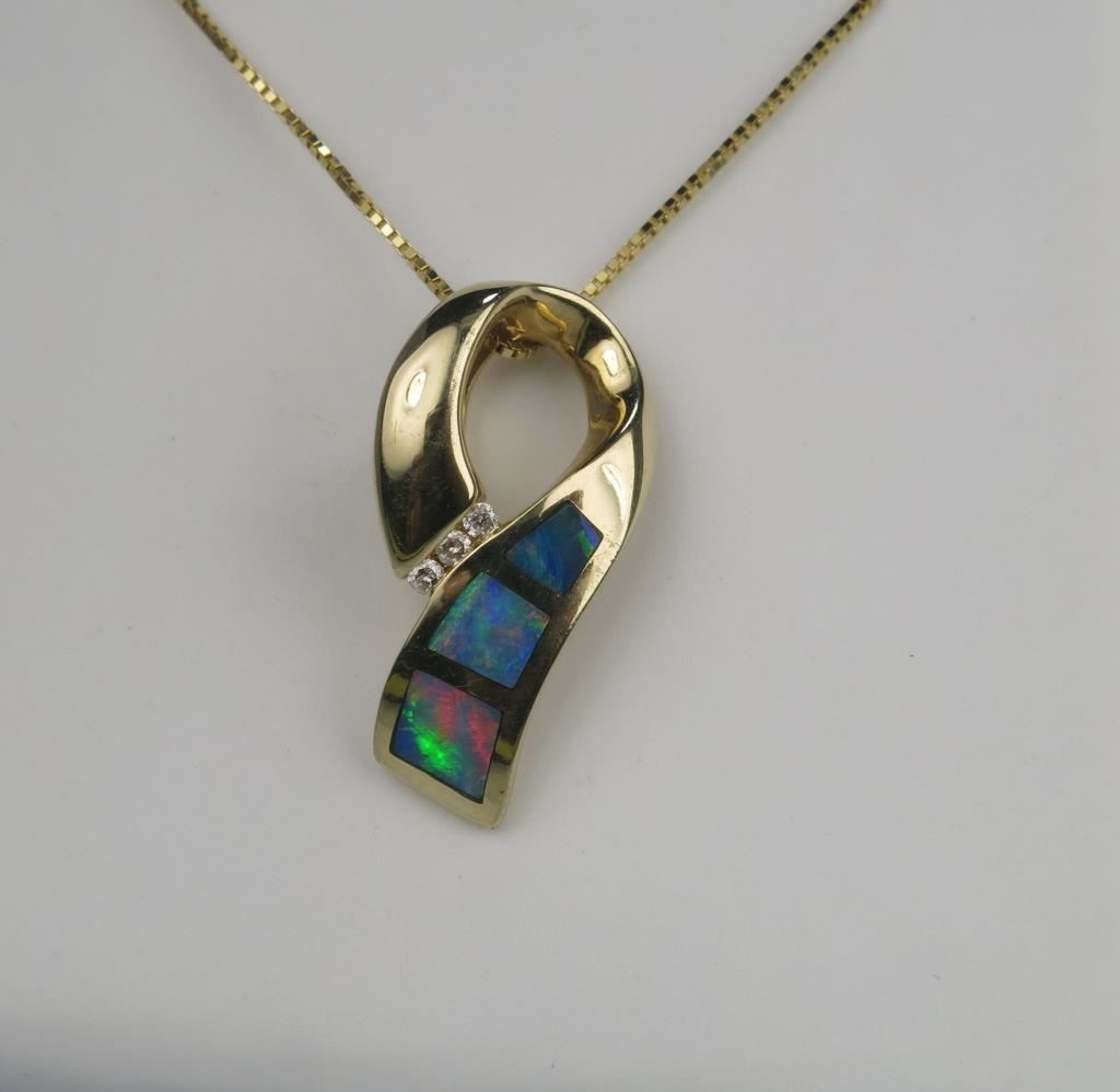 Approx. 1.50 carats of blue, green and orange color flash accented with 3 small channel set Diamonds set in 14 karat yellow gold.