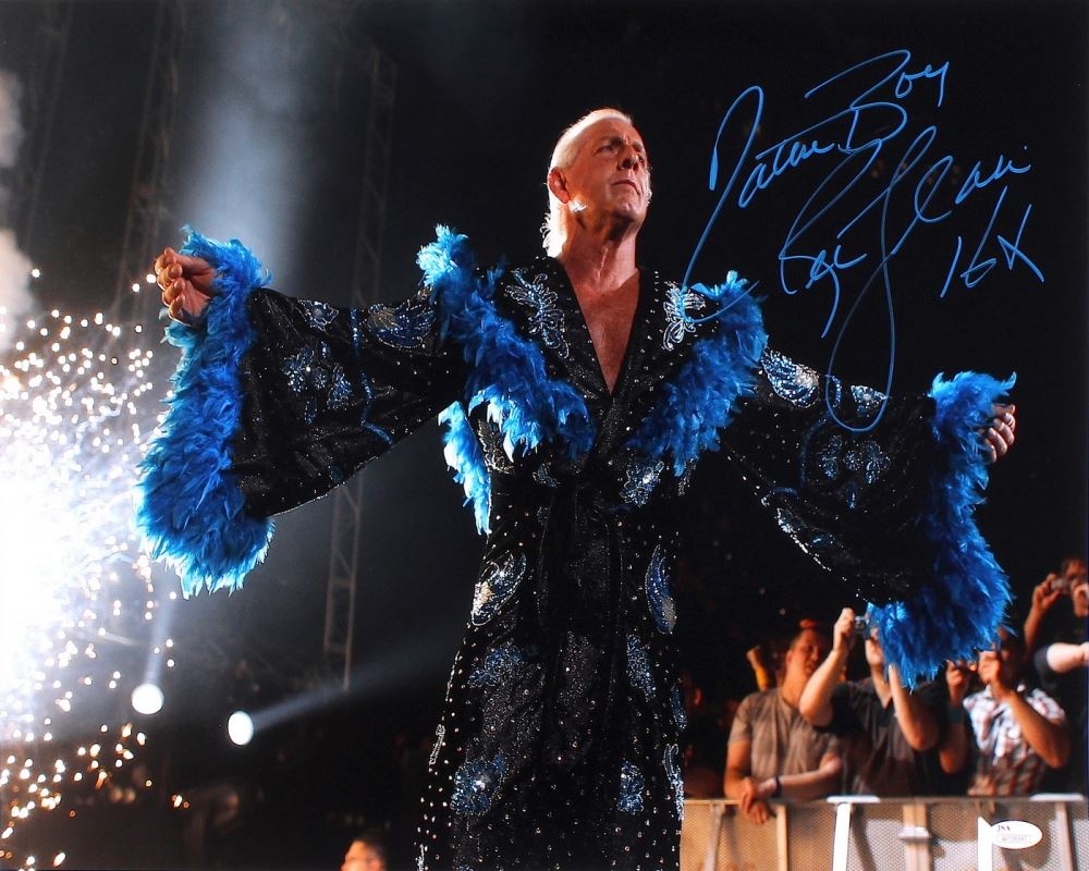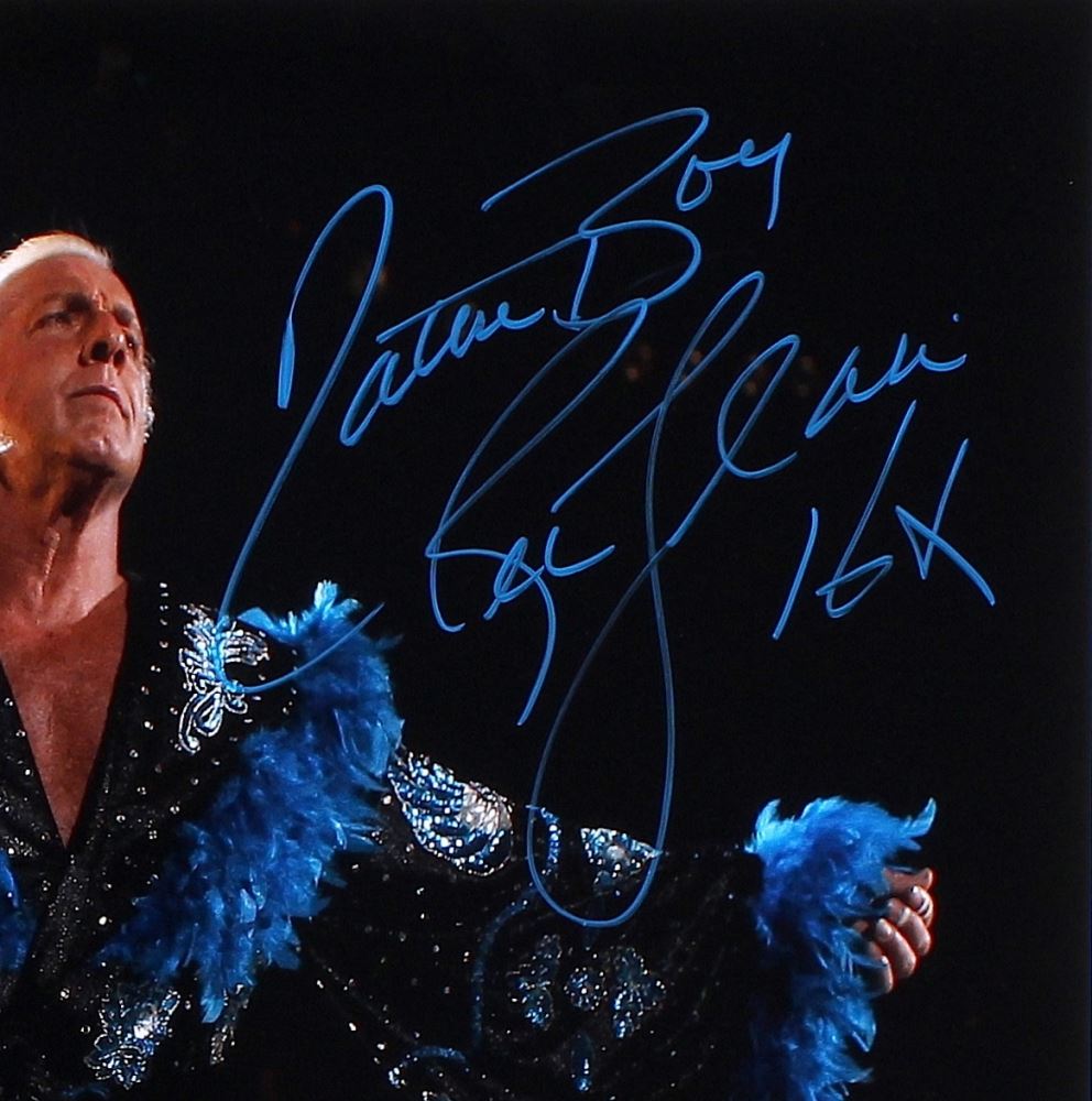 Photo measures 16 " x 20 " in size and has been hand-signed and inscribed in blue paint pen by Ric Flair. The autograph includes an official James Spence Authentication (JSA) hologram and matching COA for authenticity purposes. The signing of this item was witnessed by JSA.