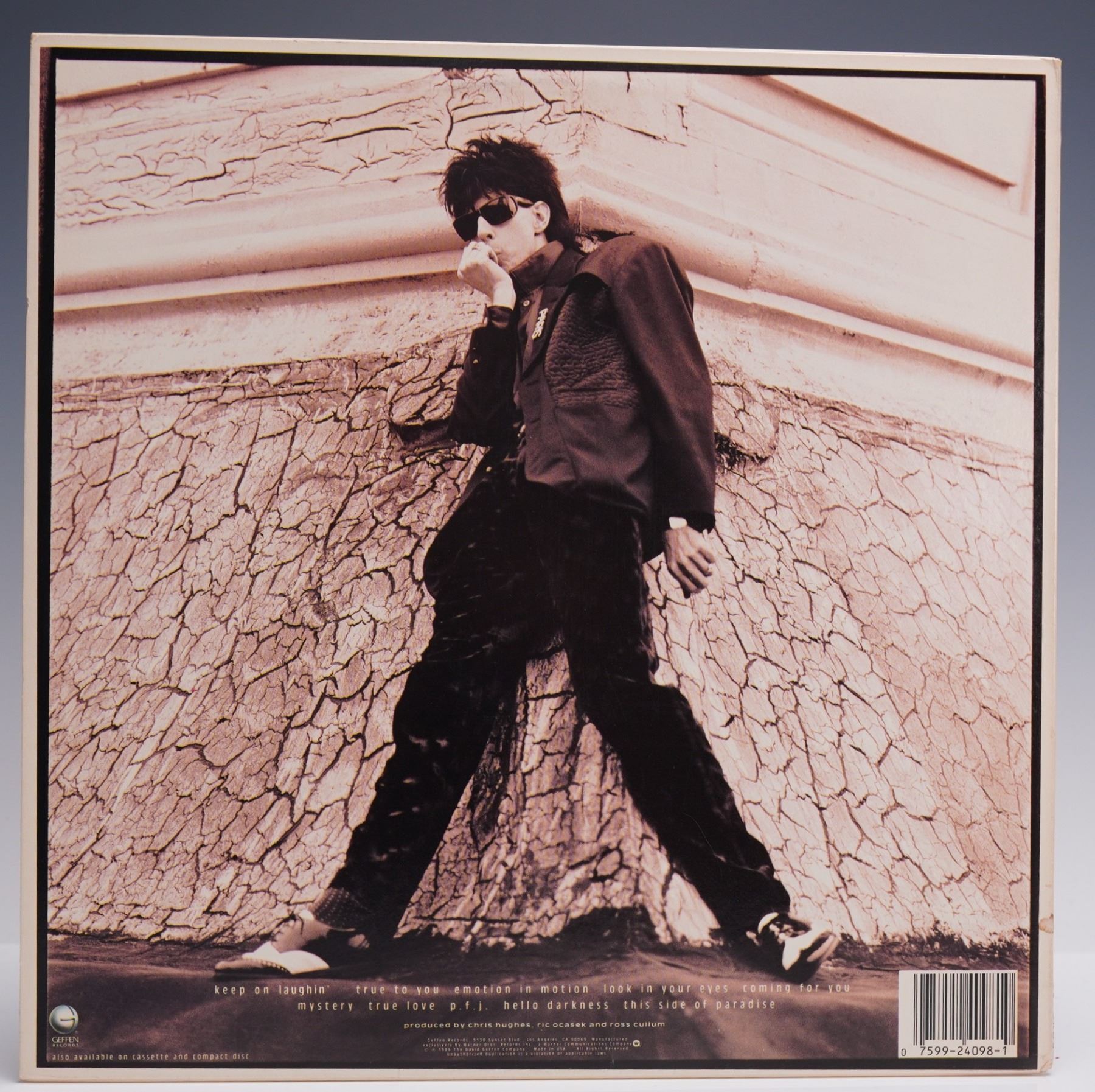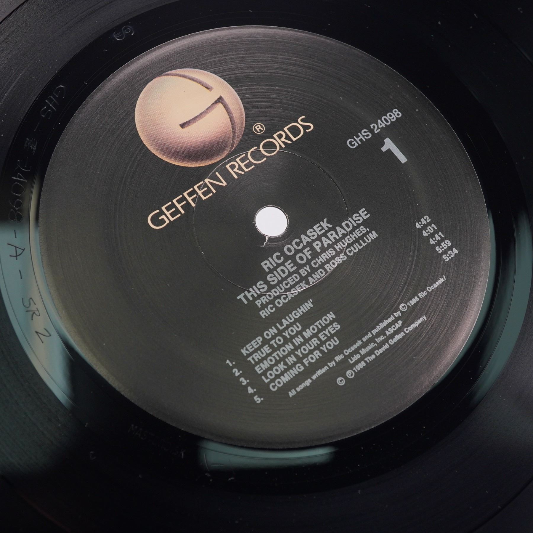 Original 1986 vinyl LP This Side of Paradise by Ric Ocasek, released by Geffen Records (GHS 24098). Features a blend of new wave and rock stylings, including the standout tracks "Emotion in Motion," "True to You," and "Keep on Laughin'." The album was produced by Chris Hughes, Ric Ocasek, and Ross Cullum. Includes the original cover art with full-color printed inner sleeve showing stylized portraits and track listings.