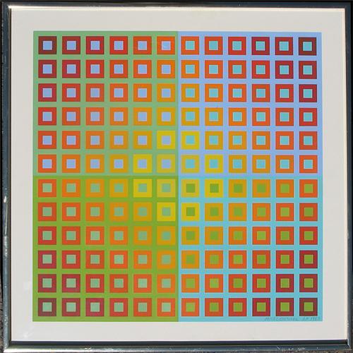 (Ricard) Anuszkiewicz silkscreen on paper; geometric design; pencil signed (L.R.); artist's proof; framed; image size 18 1/2" x 18 1/2"; no visible defects