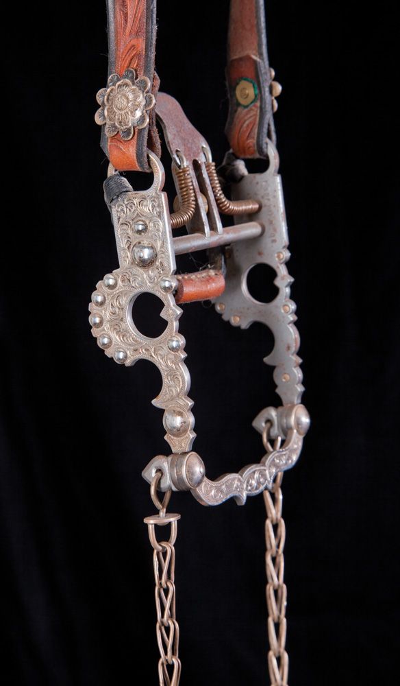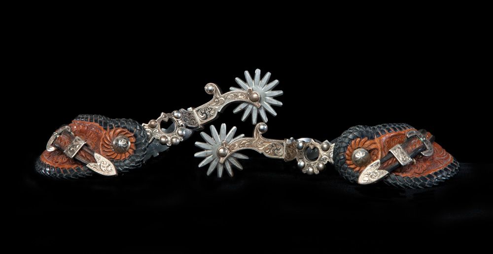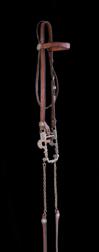 Silver overlaid fancy California style spurs with tooled and laced two-tone leathers plus Santa Barbara style spade bit on tooled leather headstall. Spurs are 3 1/2” front to back, overall with the straps they are 5 1/4”. They have 1 3/8” shanks with 1 1/8” 14 point rowels, the bit is 4” from top to bottom and the bridle cheeks are 1/2” wide.