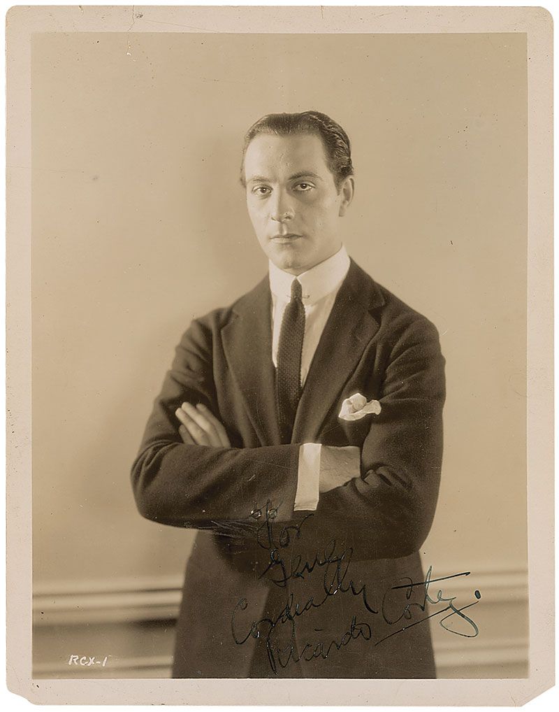Vintage glossy 8 x 10 MGM publicity photo, signed and inscribed in fountain pen “For Gene, Cordially, Ricardo Cortez.” In very good condition, with scattered creases and impressions, paper loss to both lower corners, two tears to the top border, and moderate contrast to the inscription and signature.