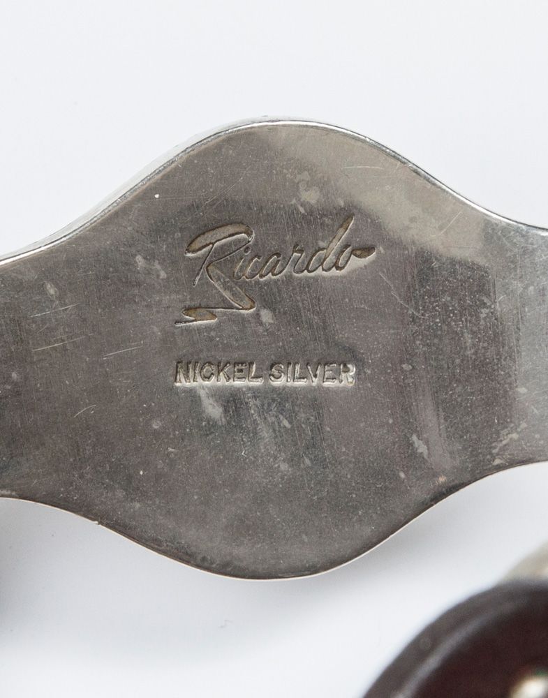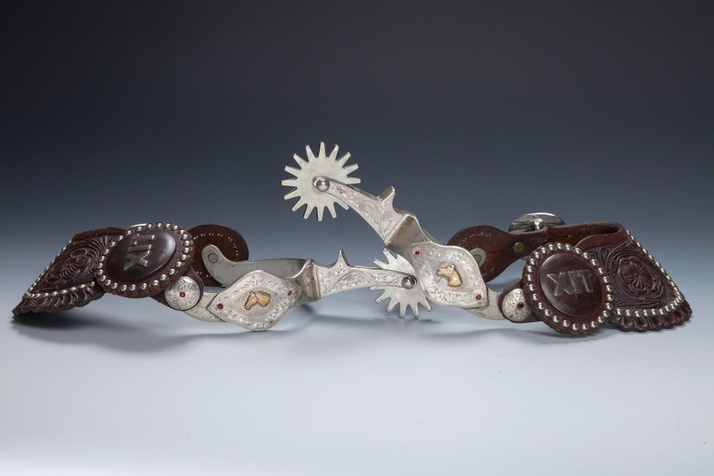 Ricardo, Denver Colorado Parade Spurs. Maker-marked, solid nickel silver "Ricardo" spurs, with swelled heelbands and fancifully engraved sterling silver overlaid mountings adorned with 10K gold horseheads and inset rubies. Includes nickel studded straps with XIT conchos. Pictured as pattern No. 957 in the Ricardo catalog, these showy parade spurs cost $38.40 - comparably priced with the more expensive spurs of other period makers. Excellent condition, c. 1940s-50s.