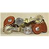 Elaborate single over laid spurs with finely engraved silver, gold horse heads and red jewels.