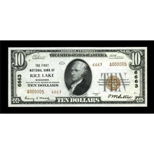 <B>Rice Lake, WI</B></I> - $10 1929 Ty. 2 <B>The First NB</B></I> Ch. # 6663<BR> A well centered beauty bearing desirable low serial number A000005. <B>Gem Crisp Uncirculated, </B></I>a premium example in every respect. <BR><BR><b>Shipping:</b> Coins & Currency (<a target="_blank" href="http://www.heritageauctions.com/common/shipping.php">view shipping information</a>)