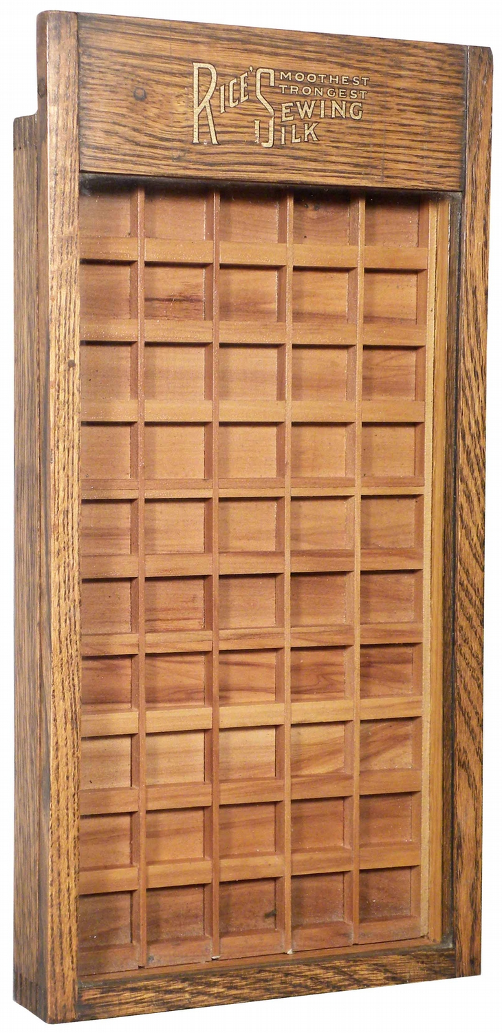 Rice's Sewing Silk Store Display Case. Glass and wood with original decals. Near mint condition. 8 1/2 X 17 X 2 inches.