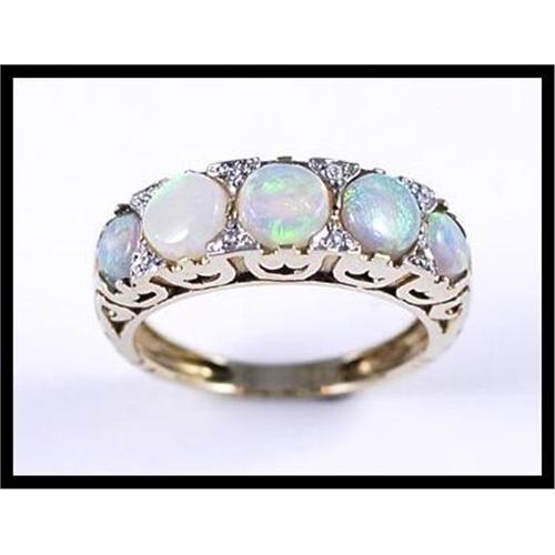 Rich ring with 5 round cut opals and 8 single cut diamonds set in 14K yellow gold. The size 7-1/4 ring measures 6.0 millimeters (0.24 inches) wide and weighs 4.20 grams total weight.