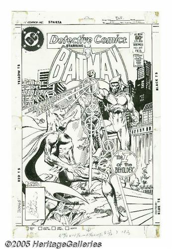 <B>Rich Buckler and Dick Giordano - Detective Comics #511 Cover Original Art (DC, 1982).</B></I> Where does reality end... and illusion begin? That's a question for the World's Greatest Detective on this cover illustration for the interior story, "The 'I' of the Beholder," written by Gerry Conway. Batman faces off against the hallucinogenic hanky-panky of Mirage, in this phantasmagoric portrayal by penciler Rich Bucker, and inker Dick Giordano. The image area measures 10" x 15" and the art includes the original logo type and masthead paste-ups. In Excellent condition.