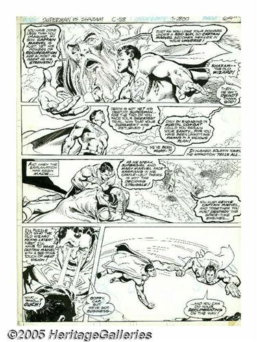<B>Rich Buckler and Dick Giordano - Limited Collectors' Edition #C-58 Superman vs. Shazam, page 64 Original Art (DC, 1978).</B></I> Not many artists can boast that there's no superhero character that they haven't drawn professionally. Rich Buckler is one of those artists. Buckler rose to prominence in the early 1970s as part of a mini-revolution that saw the likes of Jim Starlin, Bernie Wrightson, Frank Brunner, Mike Kaluta, and others take comics into new realms. One of the most prolific artists in the 1970s, Buckler's speed and vision saw his dynamic pencils grace virtually every major title at both Marvel and DC. The battle between the titans slows while Shazam explains things to Superman, in this page by penciler Buckler and inker Dick Giordano from "Superman vs. Shazam". The image area measures approximately 11" x 15". There are some blue pencil line editorial markings, and tape pieces at all four corners, otherwise this work is in Very Good condition.