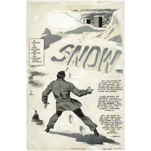<B>Rich Buckler and Wally Wood - Creepy #75, Splash Page 37 Original Art (Warren, 1975).</B></I> Luther Manning follows the footprints in the snow into this nice horror splash page for the story, "Snow," written by Bruce Bezaire and Rich Buckler. Beautifully penciled by Buckler and inked by Wally Wood, this first page has an image area of 11" x 16", and although there is a bit of yellowing in the Zipatone, the art is in Excellent condition.