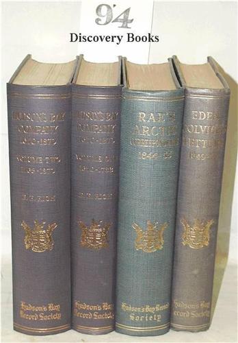 Rich, E. E, editor.. THE HISTORY OF THE HUDSON'S BAY COMPANY 1670-1870. London: Hudson's Bay Record Society 1958-59 2 vols xv,687(xv); x(2)974(xv)pp. Two colored frontispieces, 4 other plates, 2 folding maps. Cloth, t.e.g., others uncut. Original blue cloth, spines just slighty faded else very good. ……with…… JOHN RAE'S CORRESPONDENCE WITH THE HUDSON'S BAY COMPANY ON ARCTIC EXPLORATION 1844-1855. London: Hudson's Bay Record Society 1953 Edited by E. E. Rich cvi,401pp. Two plates, 3 maps. Original cloth, t.e.g., spine a bit faded else very good. …… with …… LONDON CORRESPONDENCE INWARD FROM EDEN COLVILE 1849-1852. London: Hudson's Bay Record Society 1956 Edited by E. E. Rich. cxv,300pp. Frontis plate. Original cloth, t.e.g., spine faded, several spots & partial glass ring on front else very good. (4)