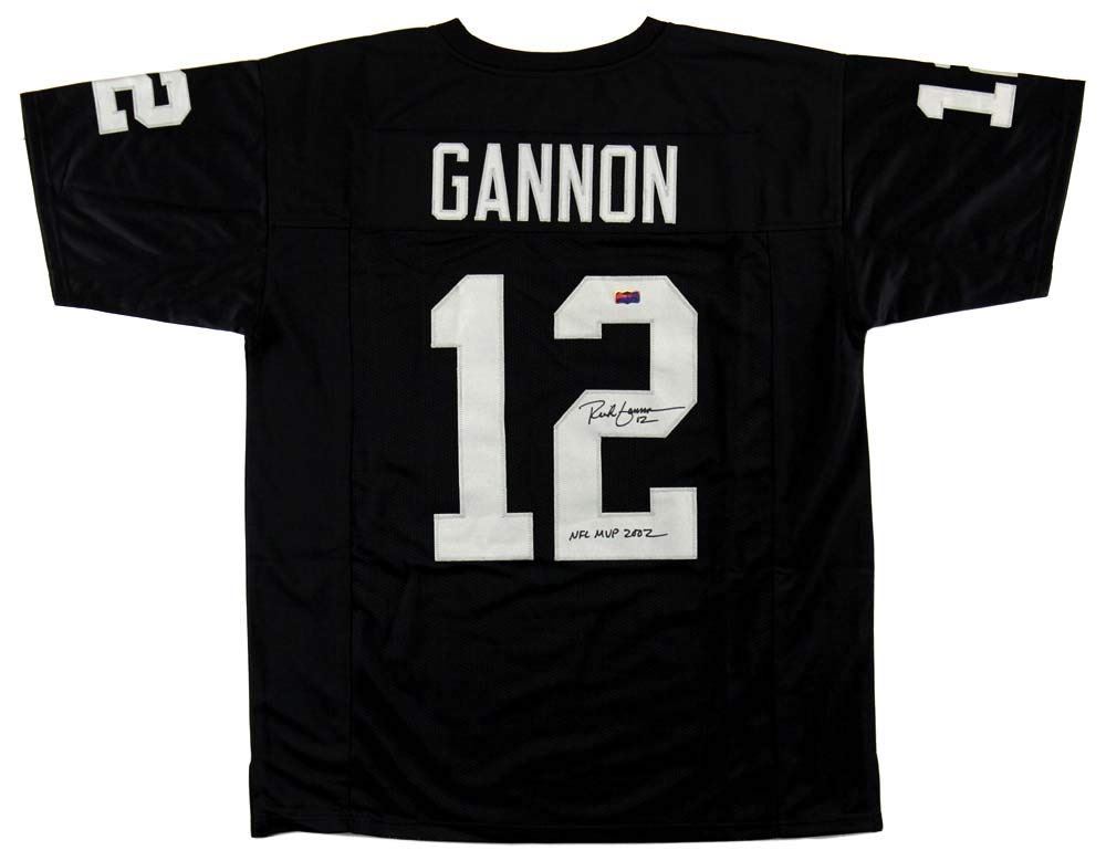 An Oakland Custom Black Jersey Hand Signed by Rich Gannon. The item and signature are in excellent condition. In addition to signing his name, Rich inscribed "NFL MVP 2002" on the item. Rich is a 4x Pro Bowl, 2x First-team All Pro, NFL MVP, 2x Bert Bell Award and NFL passing yards leader (2002).