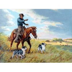 Rich Rudish. Gouache. "Bringing 'Em In With Blue And The Pup." Sight Size 14.25" x 19". signed lower left Cover Illustration For The October 1972 Issue Of Western Horseman Magazine (Included). Est $750-$1,000.