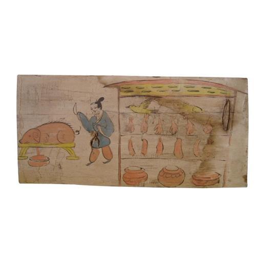 The item we take on to you is a rare and colourful Chinese Tang Dy wood panel .The picture on the wooden board portrayed lively the scene of a shambles in ancient china.In the store were put on all kinds of meat .It is turely a natural wood board,but not combined one by other materials,the texture still is obvious.Although passed sunshining and wind many years,the the colour of painting remains bright and rich,the character in the picture still keeps the vivid condition.The item is one of piece of a great artwork.We also provide other portions of the great painting for you.Please order it at once ,so you can enjoy sharing these unusual and beautiful treasures with your friends and relatives.