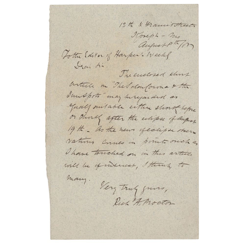 British astronomer (1837-1888) best remembered for having produced one of the earliest maps of Mars in 1867. ALS signed "Richard A. Proctor," one page, 4.5 x 7, August 8, 1887. Handwritten letter to "the Editor of Harper's Weekly," in full: "The enclosed short article on 'The Solar Corona & the Sun Spots' may be regarded as equally suitable either shortly before or shortly after the eclipse of August 19th. As the news of eclipse observations comes in points such as I have touched on in this article will be of interest, I think, to many." In fine condition. This total solar eclipse was visible across Europe, Asia, and Japan.