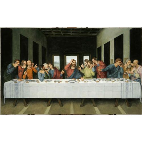 <B>Richard A. Williams - Mad #444 "The Last Supper - Circa 2004" Poster Illustration Original Art (EC, 2004).</B></I> This large painting is... hold on a minute, my cell phone is ringing! Yes, those pesky cell phones are disrupting all our lives these days! Can you imagine how they would affect the world that Jesus Christ lived it? Sure you can, thanks to this incredible <B>Mad</B></I> poster art, from the centerfold of issue #444. Artist Richard Williams really "nails" this one (Ouch! <I>Sorry</B></I>!) with his highly detailed update of da Vinci's famous "Last Supper" painting. The art, created in oils on a stretched canvas measuring 34" x 21", is in Excellent condition. You'll really have... sorry, I have to take this call! <I>From the Personal Collection of Richard Williams</B></I>.