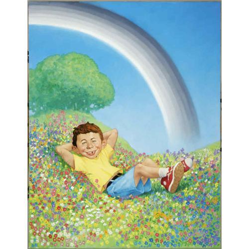 <B>Richard A. Williams - Mad Color Classics #8 Cover Original Art (EC, 2003).</B></I> At the end of every rainbow lies a pot of gold, and this particular grey-toned rainy day lightshow is no exception! Our old friend Alfred E. Neuman never looked better than he does here, posing among the posies on this gorgeous, fully painted cover by Richard Williams. This could be the ultimate <B>Mad</B></I> collectible for all of us fan-addicts who have welcomed the "What, Me Worry" kid into our homes and hearts for so many years. The piece, painted in oils on a stretched canvas, measures a whopping 28" x 36", and is in Excellent condition. <I>From the Personal Collection of Richard Williams</B></I>.