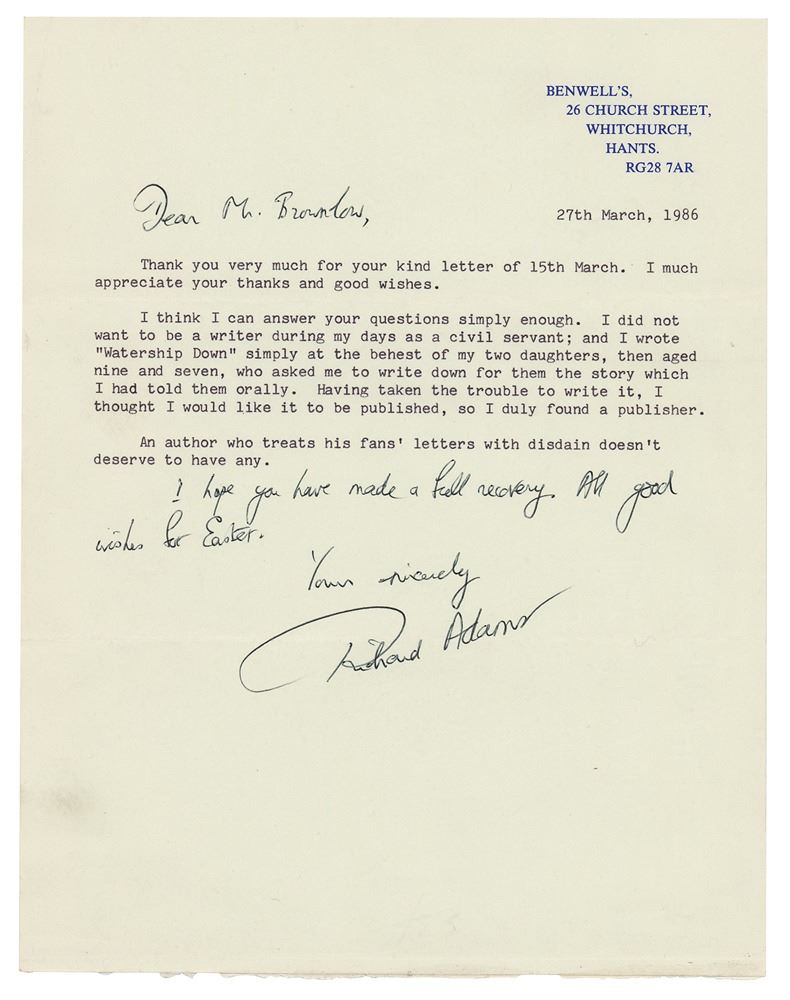 TLS signed "Yours sincerely, Richard Adams," one page, 7 x 9, Benwell's, 26 Church Street letterhead, March 27, 1986. Letter to Mr. Brownlow, in part: "I think I can answer your question simply enough. I did not want to be a writer during my days as a civil servant; and I wrote ‘Watership Down’ simply at the behest of my two daughters, then aged nine and seven, who asked me to write down for them the story which I had told them orally. Having taken the trouble to write it, I thought I would like it to be published, so I duly found a publisher. An author who treats his fans’ letters with disdain doesn’t deserve to have any." Adams adds the salutation and the postscript in his own hand, the latter of which reads: "I hope you have made a full recovery. All good wishes for Easter." In fine condition.