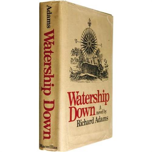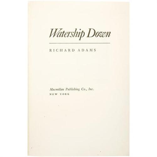 <B>Richard Adams: </B></I><B><I>Watership Down</B></I></B></I> (New York: Macmillan Publishing Co., Inc., 1972), first edition, 429 pages, tan paper boards shelf-backed in tan cloth with gilt titles, 8vo (6.25” x 9”), dust jacket. Very good condition, slightly shelf-cocked, with some edge wear, and mild wear to the dust jacket.<BR><BR><b>Shipping:</b> Books & Catalogs (<a target="_blank" href="http://www.heritageauctions.com/common/shipping.php">view shipping information</a>)
