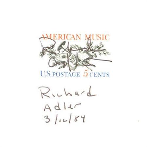 <B>Richard Adler Autograph.</B></I> A 5" x 3" notecard, with a five-cent stamp affixed, signed by the Tony Award-winning songwriter/composer in black ink. Adler's autograph spans the face of the stamp, while he printed his name beneath and dated the signature 1984. In Excellent condition with very mild age-toning.<BR><BR><b>Shipping:</b> Flat Material, Small (<a target="_blank" href="http://www.heritageauctions.com/common/shipping.php">view shipping information</a>)