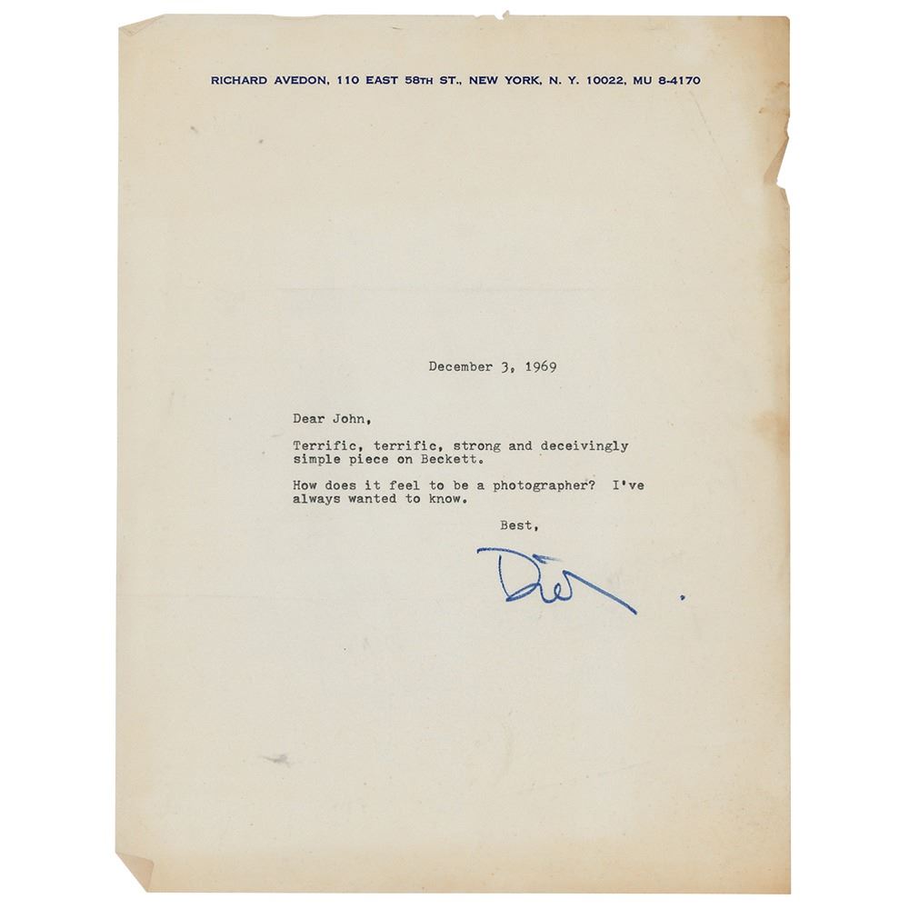 TLS signed “Dick,†one page, 8.5 x 11, personal letterhead, December 3, 1969. Avedon writes to art critic, author, and fellow photographer, John Gruen, in full: “Terrific, terrific strong and deceivingly simple piece on Beckett. How does it feel to be a photographer? I've always wanted to know." In fine condition. Avedon refers to Gruen's article on Samuel Beckett entitled 'Samuel Beckett Talks About Beckett,' which was published in the December 1969 issue of Vogue magazine.