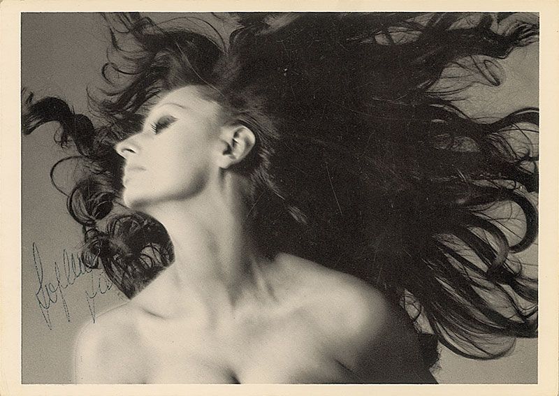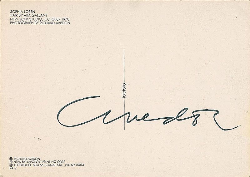Glamorous 6 x 4.25 postcard photo of Sophia Loren taken by Avedon, signed on the reverse in black felt tip, “Avedon,” and signed on the image side in black ink by Loren. A few light creases to image side and some irregular adhesion to Loren’s signature, otherwise fine condition.