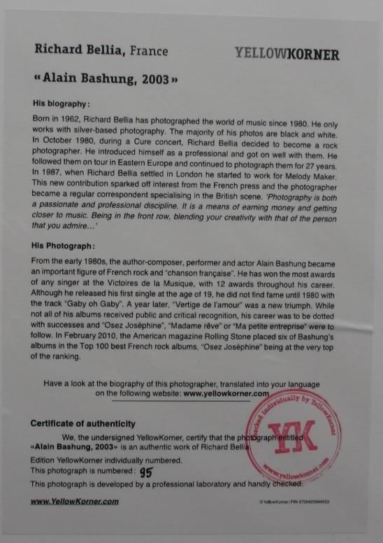 Alain Bashung, 2003 Certified Photograph, Richard Bellia YellowKorner Certified Photograph. Certificate of Authenticity from YellowKorner affixed to the back. Matted Dimensions 16"x20". Protected with Clear Mylar Sleeve.