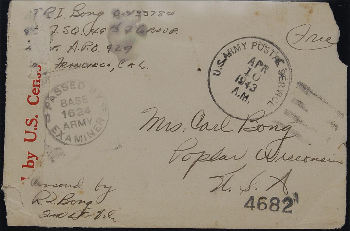 As a college student he learned to fly in the Civilian Pilot Training program; at the age of 20 he became a flying cadet in the US Army Air Corps, in time for the entry of America into World War II. Bong became America's all-time Ace of Aces, downing 40 enemy planes in the Pacific theater of the war while flying P-38 fighter planes. His many decorations for outstanding skills and extraordinary courage included the Congressional Medal of Honor. Hand-addressed free-franked mailing envelope, 5.25 x 3.75, addressed in Bong’s hand to “Mrs. Carl Bong, Poplar, Wisconsin, U.S.A.,” and signed in the upper left corner “Ct. R. I. Bong, SQ. 49th F. Group, A.P.O. 929t, [San] Francisco, Cal,” and also signed in the lower left, “Censored by R. I. Bong.” Double matted and framed with a portrait of Bong, a set of Air Force wings, and a 5th Fighter Wing patch, to an overall size of 14.5 x 31.25. In very good condition, with slight edge loss to vertical sides, scattered light toning and soiling, partial censor label over return address, and a moisture spot to return address. Oversized. Pre-certified PSA/DNA and RRAuction COA.