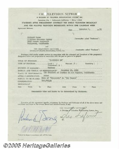 <B>Richard Boone Signed Contract.</B></I> A one-page, 8.5" x 11" standard AFTRA agreement, dated November 4, 1959, for TV and movie actor Richard Boone -- best known for his role as Paladin on "Have Gun, Will Travel" -- to appear on "Playhouse 90." In fine condition, with Boone's signature at the bottom in blue ink. <I>With COA from PSA/DNA.</B></I>