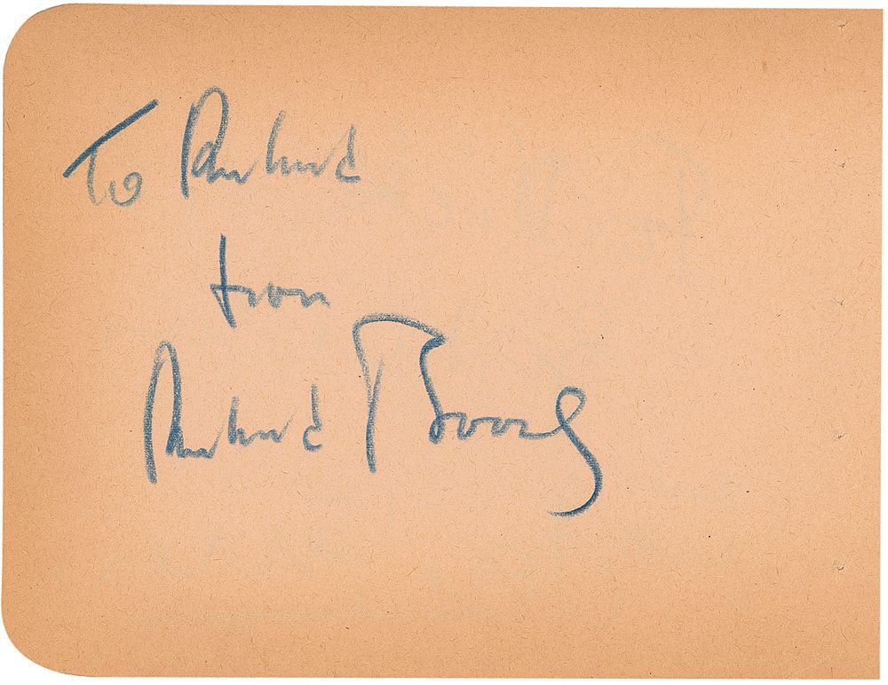 Vintage heavy blue pencil signature and inscription, “To Richard, from Richard Boone,” on an off-white 6 x 4.5 album page. In fine condition, with moderate toning working in from the edges and some show-through from Jose Ferrer’s signature on the reverse.