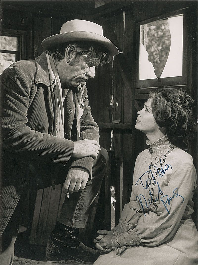 Vintage glossy 7 x 9.5 photo of Boone from Hombre, signed and inscribed in fountain pen, “To Peter, Richard Boone.” In fine condition, with a small tear to the right edge and slightly trimmed edges.