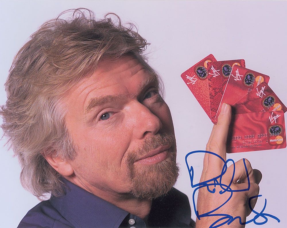 Color satin-finish 10 x 8 photo of Branson fanning out four Virgin Master Cards, signed in blue felt tip. In very fine condition.