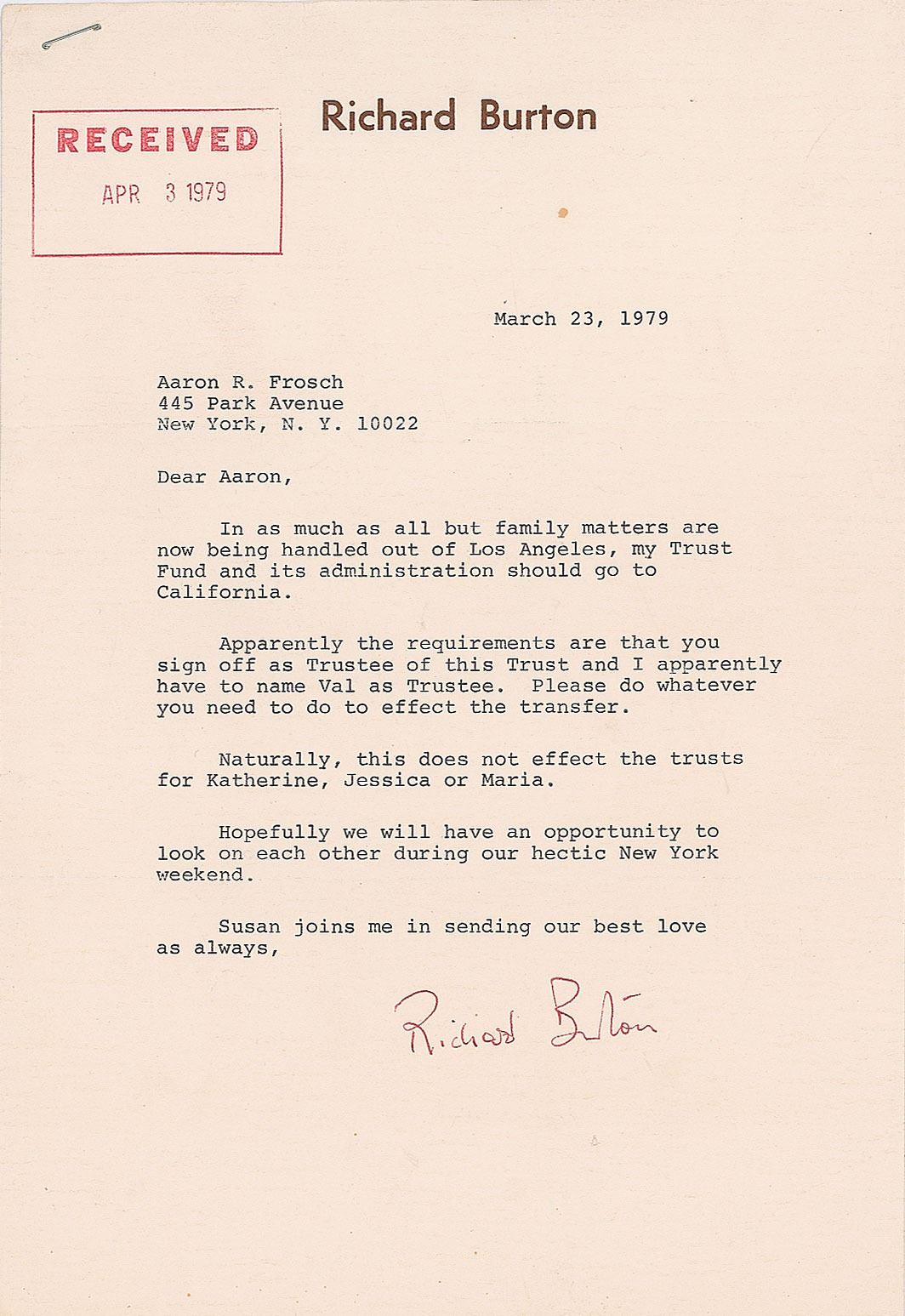 TLS, one page, 7.25 x 10.5, personal letterhead, March 23, 1979. Letter to lawyer Aaron R. Frosch, in part: "In as much as all but family matters are now being handled out of Los Angeles, my Trust Fund and its administration should go to California. Apparently the requirements are that you sign off as Trustee of this Trust and I apparently have to name Val as Trustee. Please do whatever you need to do to effect the transfer." In fine condition.