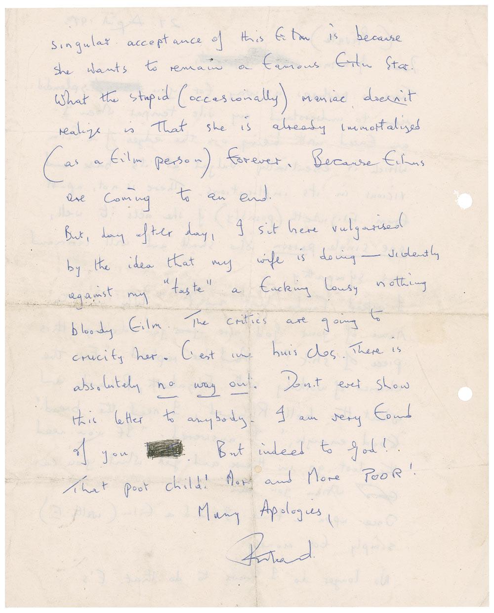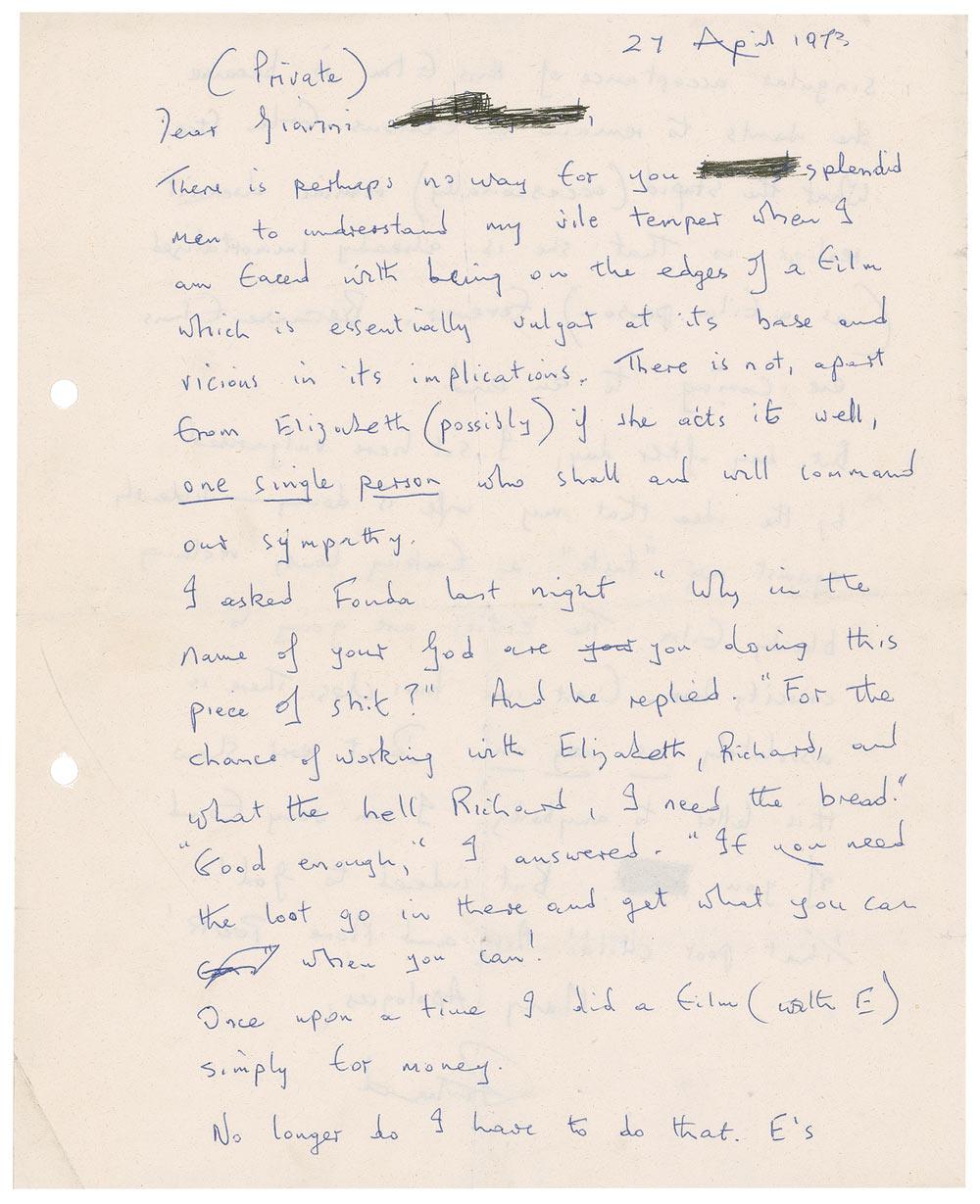 ALS signed “Richard,” one page both sides, 8 x 9.5, April 27, 1973. Marked “Private” at the top of the page, Burton writes “Gianni.” In full: “There is perhaps no way for you splendid men to understand my vile temper when I am faced with being on the edges of a film which is essentially vulgar at its base and vicious in its implications. There is not, apart from Elizabeth (possibly) if she acts it well, one single person who shall and will command our sympathy. I asked Fonda last night ‘Why in the name of your God are you doing this piece of shit?’ And he replied ‘For the chance of working with Elizabeth, Richard, and what the hell Richard, I need the bread.’ ‘Good enough,’ I answered. ‘If you need the loot go in there and get what you can when you can!’ Once upon a time I did a film (Walter E.) simply for the money. No longer do I have to do that. E’s singular acceptance of this film is because she wants to remain a famous enter. star. What the stupid (occasionally) maniac doesn’t realize is that she is already immortalized (as a film person) forever. Because films are coming to an end. But, day after day, Is here vulgarised by the idea that my wife is doing—violent against my ‘taste’ a fucking lousy nothing bloody film. The critics are going to crucify her…There is absolutely no way out. Don’t ever show this letter to anybody. I am very fond of you. But indeed to God! That poor child! More and more poor!” A few words have been crossed out. Intersecting horizontal and vertical folds, a few tiny edge tears, creased lower left corner, wrinkling, and two punch holes along the left side, otherwise fine condition.