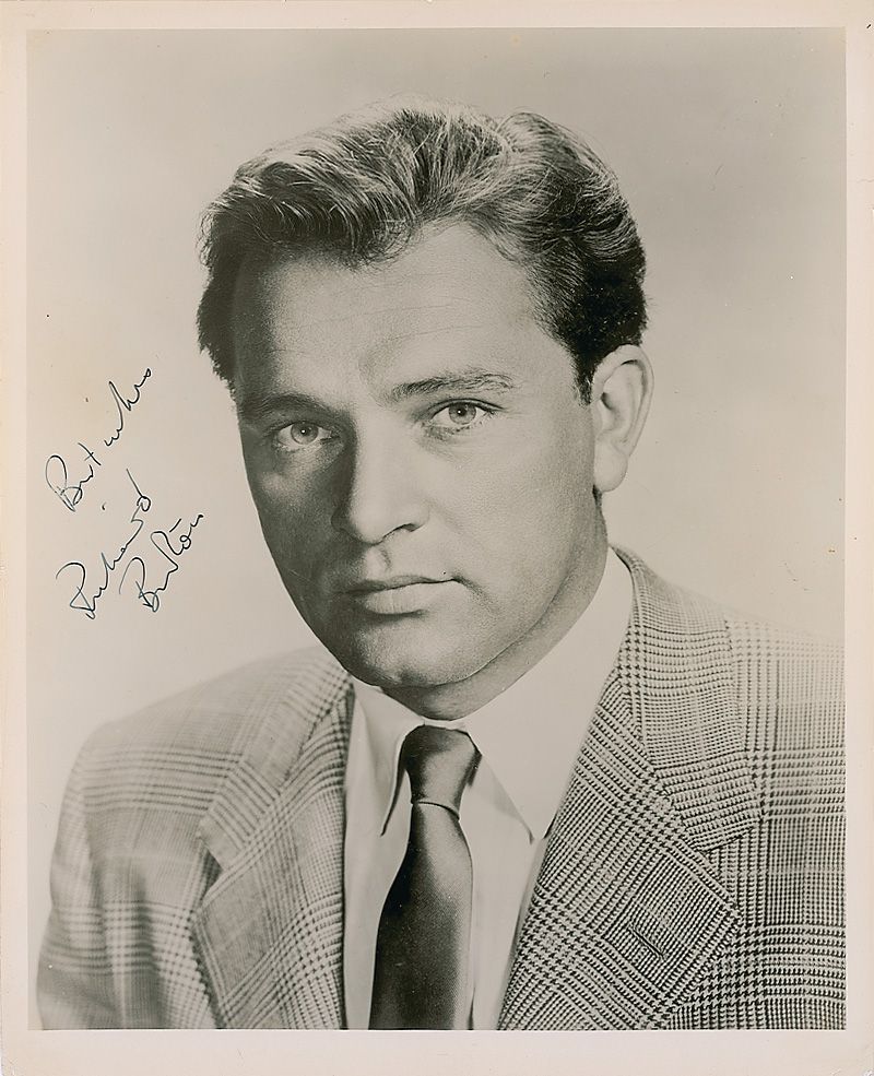 Vintage glossy 8 x 10 photo, signed in fountain pen, “Best wishes, Richard Burton.” In very good to fine condition, with scattered creases and surface marks and some scattered light spotting to finish.
