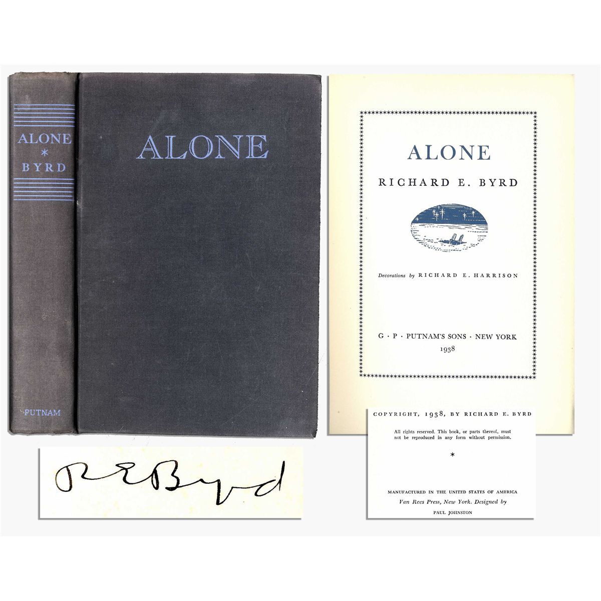 Admiral Richard E. Byrd signed ''Alone''. G.P. Putnam's Sons: New York: 1938. The author signs this account of his Antarctic explorations on the front free endpaper: ''R E Byrd''. The 5.5'' x 8'' book is bound in blue cloth boards with blue lettering & blue top edge. Minor fading to top edge of boards and backstrip, and lacking dustjacket. Overall very good condition.