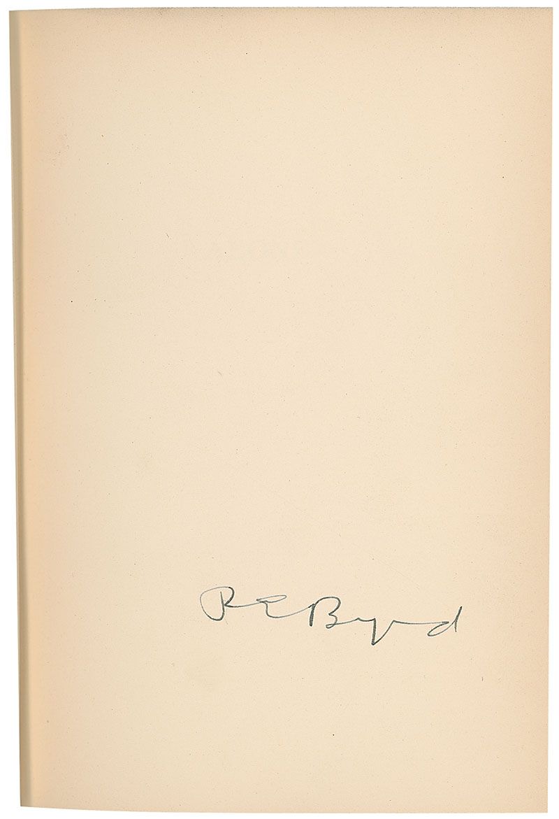 Signed book: Alone. First edition. NY: G.P. Putnam’s Sons, 1938. Hardcover, 5.75 x 8.25, 296 pages. Signed in fountain pen on the third free end page, “R. E. Byrd.” In fine condition, with front hinge a bit loose and scattered mild wear to covers and spine.