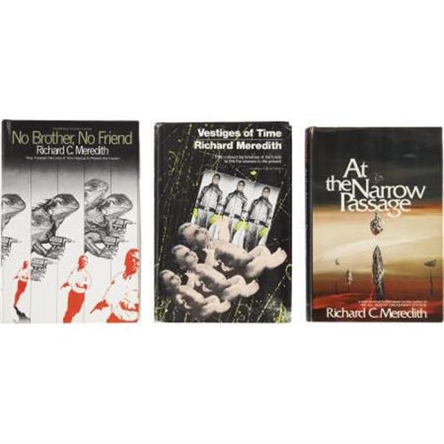 <B>Richard C. Meredith. Three First Editions</B></I>, including: <B><I>At the Narrow Passage</B></I></B></I>. New York: G. P. Putnam's Sons [1973]. Octavo. 256 pages. Orange cloth with black titles on spine and front cover. Overall, book and dust jacket are fine. [and:] <B><I>No Brother, No Friend</B></I></B></I>. Garden City, NY: Doubleday and Company, Inc., 1976. Octavo. 210 pages. Gray binding with black spine titles. Overall, book and dust jacket are fine. [and:] <B><I>Vestiges of Time</B></I></B></I>. Garden City, NY: Doubleday and Company, Inc., 1978. Review copy. Octavo. 186 pages, untrimmed. Black binding with red spine titles. Overall, book and dust jacket are fine. <I>From the Robert and Diane Yaspan Collection.</B></I><BR><BR><b>Shipping:</b> Books & Catalogs (<a target="_blank" href="http://www.heritageauctions.com/common/shipping.php">view shipping information</a>)