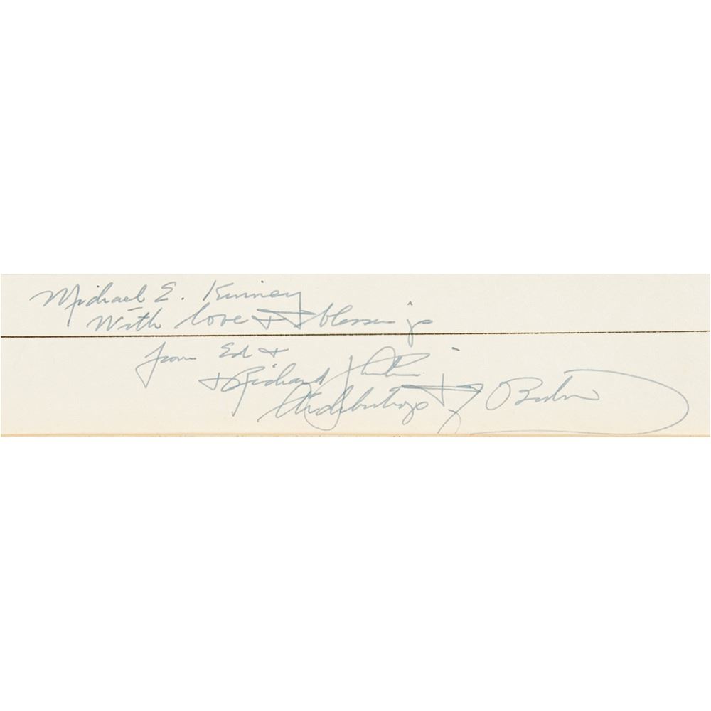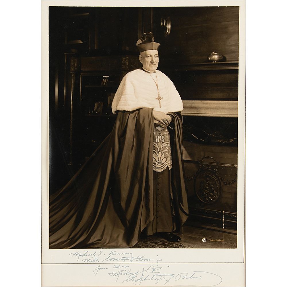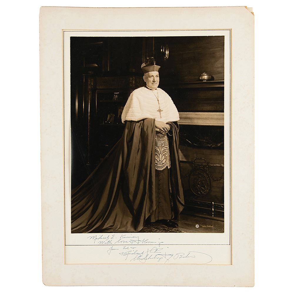 Vintage matte-finish 10.25 x 13.25 full-length photo of Cardinal Cushing by Fabian Bachrach, affixed to its original 11.5 x 16 mount, signed and inscribed on the mount in fountain pen, "Michael E. Kinney, with love & blessings…Richard J. Cushing, Archbishop of Boston.†Matted to an overall size of 14.5 x 19. In very good to fine condition, with light foxing, staining, and corner loss only to the mat.